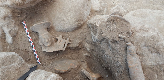 Επίσης, για πρώτη φορά ήρθαν στο φως, σφαιρικός αρύβαλλος (σ.σ.: μικρό σφαιρικό αγγείο με στενό στόμιο) από φαγεντιανή, πήλινα ειδώλια καθιστής σε θρόνο γυναικείας μορφής που κρατά περιστέρι και ένθρονης Σφίγγας με λύρα. Βρέθηκαν δύο πλαστικά αγγεία με όρθια γυναικεία μορφή και με προτομή ανδρικής μυθικής μορφής με δορά ζώου στο κεφάλι, πιθανώς του Ηρακλή, που χρονολογούνται στα αρχαϊκά χρόνια.