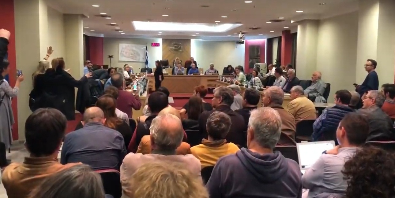Η πρόεδρος του δημοτικού συμβουλίου διέκοψε τη συνεδρίαση για να ηρεμήσουν τα πνεύματα. Είχε προηγηθεί η τοποθέτηση του εκπροσώπου των κατοίκων που διαμαρτύρονται για το προσφυγικό και η τοποθέτηση του επικεφαλής της δημοτικής παράταξης «Η Καλαμαριά Αλλιώς». Στην ομιλία του ο δήμαρχος Καλαμαριάς, Γιάννης Δαρδαμανέλης ξεκαθάρισε ότι δεν υπάρχει κάποια ενημέρωση από την πλευρά της κυβέρνησης για εγκατάσταση μεταναστών και προσφύγων στην περιοχή. Πρόσθεσε, ότι το πρώην νοσοκομείο Παναγία είναι ιδιωτικός χώρος και το στρατόπεδο Κόδρα είναι χαρακτηρισμένος αρχαιολογικός χώρος άρα δεν μπορούν να εγκατασταθούν σε αυτούς τους χώρους πρόσφυγες ή μετανάστες. Εκτός της αίθουσας υπήρχε ισχυρή αστυνομική δύναμη για την αποτροπή επεισοδίων.