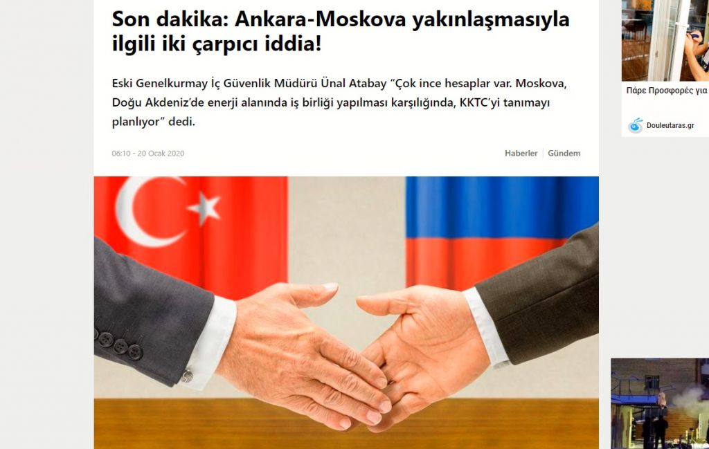 Σε σχετικό του ρεπορτάζ το sigmalive επισημαίνει πως μιλώντας στην τουρκική εφημερίδα «Σοζτζού», που πρόσκειται στην αντιπολίτευση, o Τούρκος πρώην αξιωματούχος του υπουργείου Άμυνας ανέφερε χαρακτηριστικά ότι «για να αρθούν τα εμπόδια στη Συρία και να υπάρξει συνεργασία στην Μεσόγειο, η Ρωσία σχεδιάζει να αναγνωρίσει τη λεγόμενη ΤΔΒΚ. Αντίστοιχα ενδέχεται αναγνώριση της Αμπχαζίας από την Τουρκία».