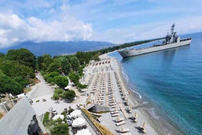 του Πολεμικού Ναυτικού να ρίχνει άγκυρα μια ανάσα μακριά από τις ομπρέλες και τις ξαπλώστρες.