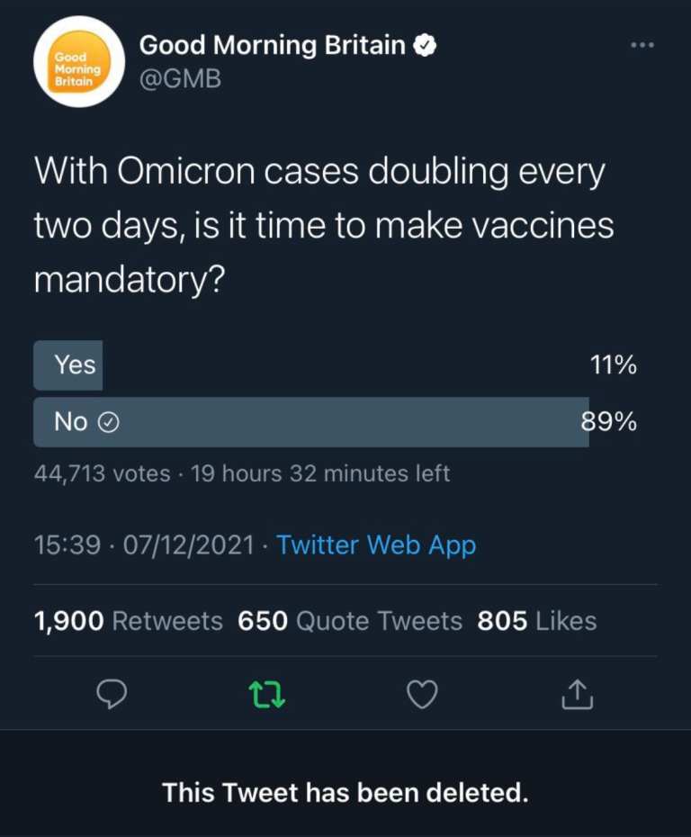 Η δημοσκόπηση έλαβε 44.713 ψήφους πριν διαγραφεί από την GMB, πιθανότατα λόγω του γεγονότος ότι 9 στους 10 ανθρώπους ψήφισαν και πάλι "Όχι" στον υποχρεωτικό εμβολιασμό.