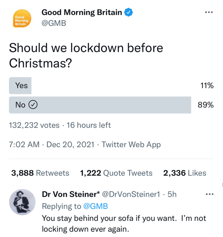 Το Good Morning Britain (GMB) δημοσίευσε τη δημοσκόπηση στο Twitter στις 07:02 π.μ. της Δευτέρας 20 Δεκεμβρίου 2021 και ρώτησε "Πρέπει να κλειδώσουμε πριν από τα Χριστούγεννα;".