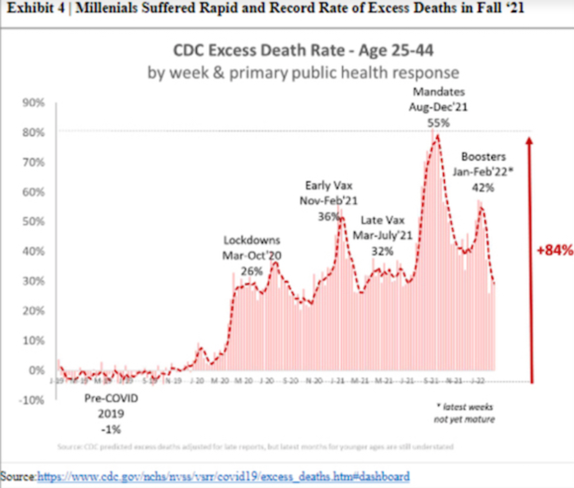 Οι Millennials, περίπου ηλικίας 25 έως 40 ετών, παρουσίασαν αύξηση 84% στην υπερβάλλουσα θνησιμότητα το φθινόπωρο, είπε, περιγράφοντάς το ως τη «χειρότερη υπερβολική θνησιμότητα ποτέ, νομίζω, στην ιστορία». Ήταν η υψηλότερη αύξηση των υπερβολικών θανάτων από οποιαδήποτε ηλικιακή ομάδα πέρυσι, επτά φορές υψηλότερη από τη Silent Generation, εκείνων που είναι άνω των 85 ετών.