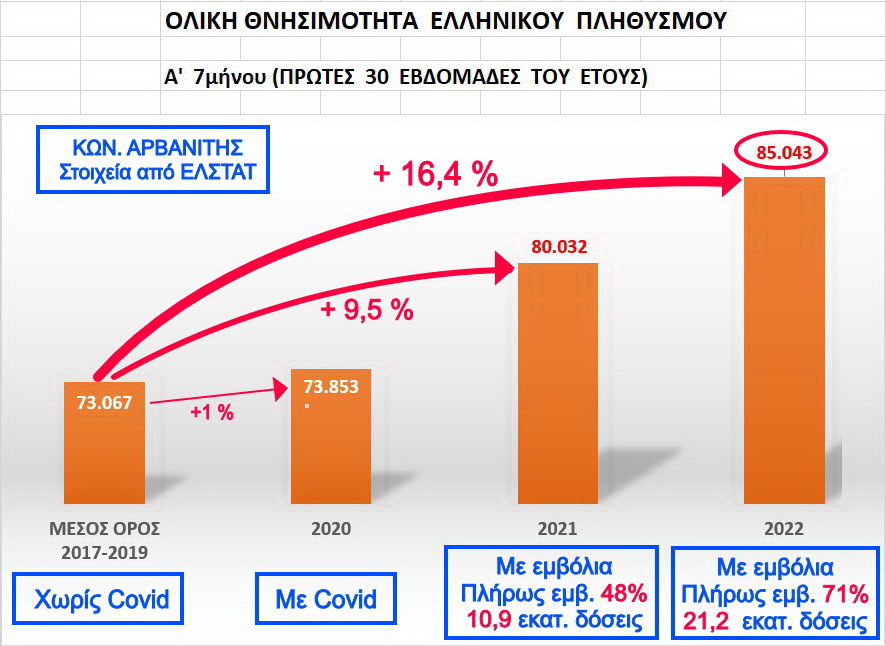 Με νέα παρέμβαση του και χρησιμοποιώντας τα στοιχεία της ΕΛΣΤΑΤ για το πρώτο επτάμηνο του 2022 ο γνωστός καρδιολόγος Κωνσταντίνος Αρβανίτης αποκαλύπτει ότι η συνολική θνησιμότητα στην Ελλάδα φέτος σε σχέση με το 2020 όταν πρωτοξεκίνησε η πανδημία, παρουσιάζει αύξηση κατά 25% μετά την διετή περίοδο των lockdowns και των εκβιαστικών μαζικών εμβολιασμών!