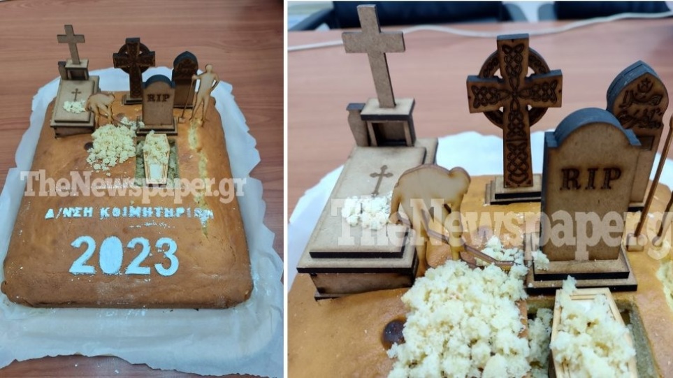 Viral έγινε η βασιλόπιτα που έκοψαν στο Κοιμητήριο Βόλου, καθώς αντί για χριστουγεννιάτικα στολίδια, περιείχε τάφους, σταυρούς, ακόμα και νεκροθάφτες που έσκαβαν.